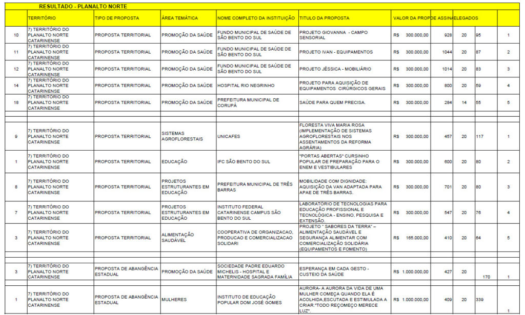 Durante a assembleia, foram escolhidos 10 projetos territoriais e 2 projetos de alcance estadual, um na área da saúde e outro em áreas diversas, que serão contemplados com recursos das emendas de Uczai. O objetivo é  democratizar a distribuição das verbas, tornando o processo mais transparente e alinhado às reais necessidades das comunidades.