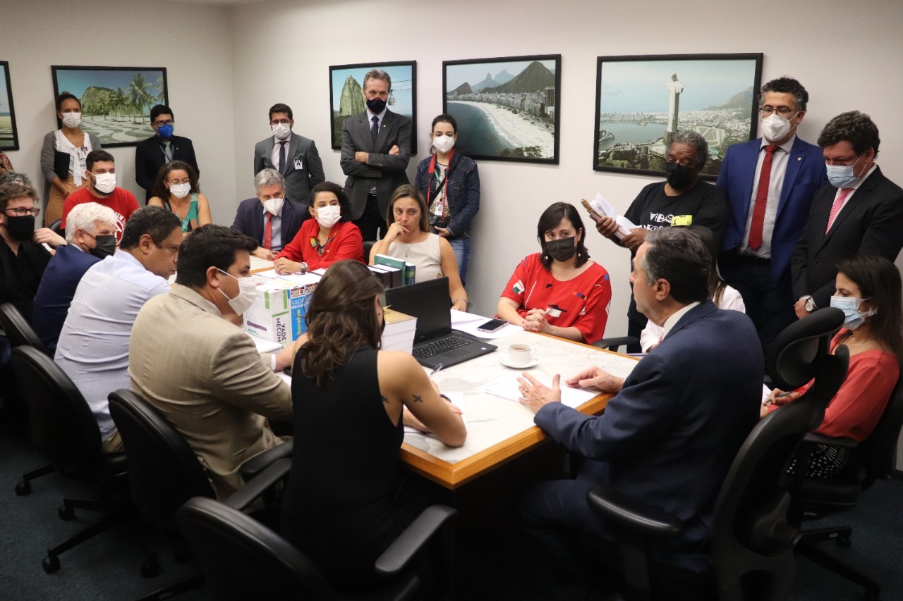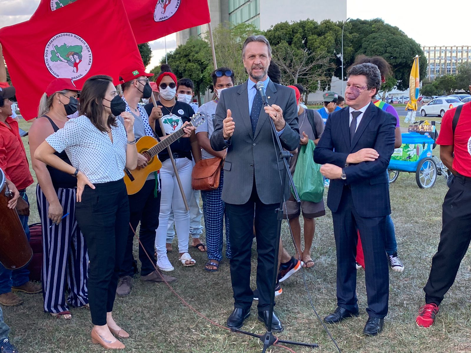 O deputado federal Pedro Uczai (PT-SC), junto de outros parlamentares da oposição e representantes do Movimento dos Trabalhadores Sem Teto (MTST), Movimento dos Trabalhadores Rurais