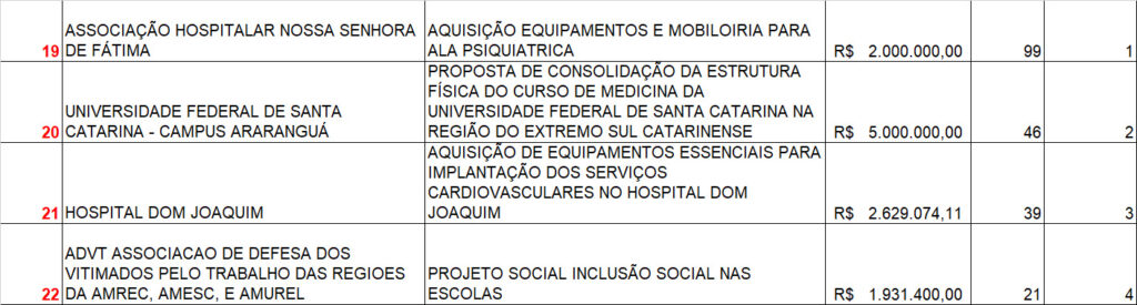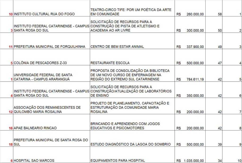 O edital também destaca áreas que dão maior preferência na apresentação das propostas. “Buscamos propostas que estejam alinhadas com as políticas públicas e programas implementados pelo Governo Federal, como: projetos estruturantes em educação, de participação e educação popular, de promoção da saúde e da alimentação saudável, também relacionados à transição energética e sistemas agroflorestais. Que vão ao encontro daquilo que acreditamos e sonhamos para Santa Catarina”, destaca.